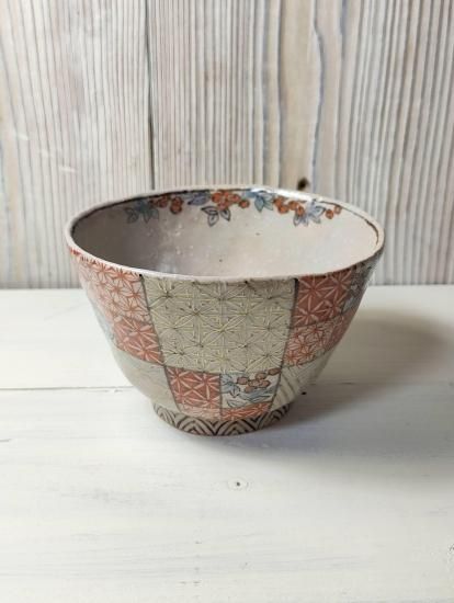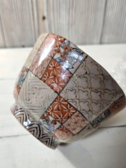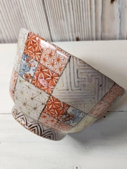 格子に金彩や赤絵付けの細かな模様が重厚な印象の小丼
