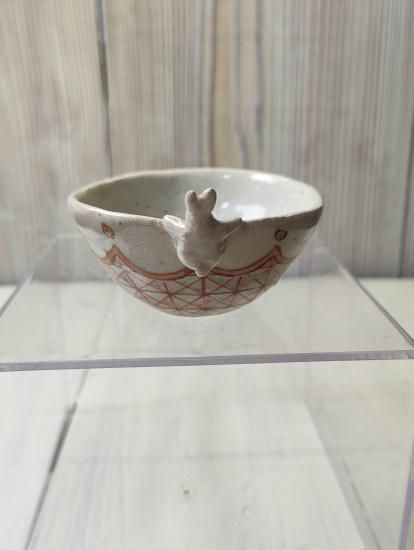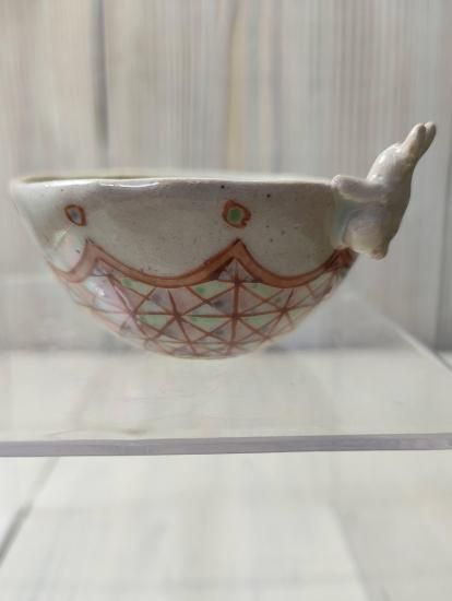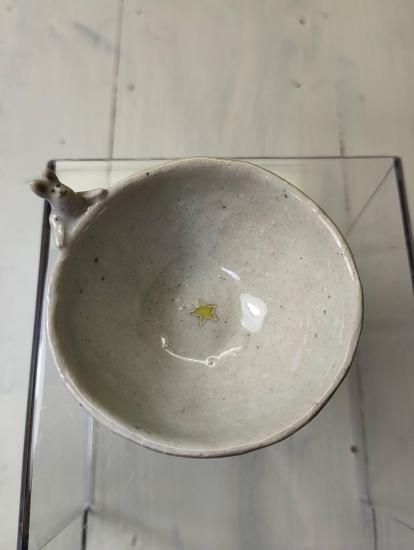 下絵、上絵、金彩と巧みに使い分けながら色を重ねて器の中に描かれた風景には、可愛らしい生き物たちが時折顔を出していて思わずにっこりとしてしまいます。